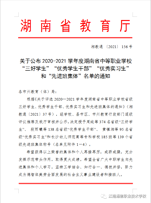 經(jīng)學(xué)校評(píng)議、推薦,岳陽市教育局、湖南省教育廳審核評(píng)定2020-2021學(xué)年度湖南省中等職業(yè)學(xué)?!笆〖?jí)三好學(xué)生、優(yōu)秀學(xué)生干部、優(yōu)秀實(shí)習(xí)生、先進(jìn)班級(jí)體”評(píng)選結(jié)果新鮮出爐!